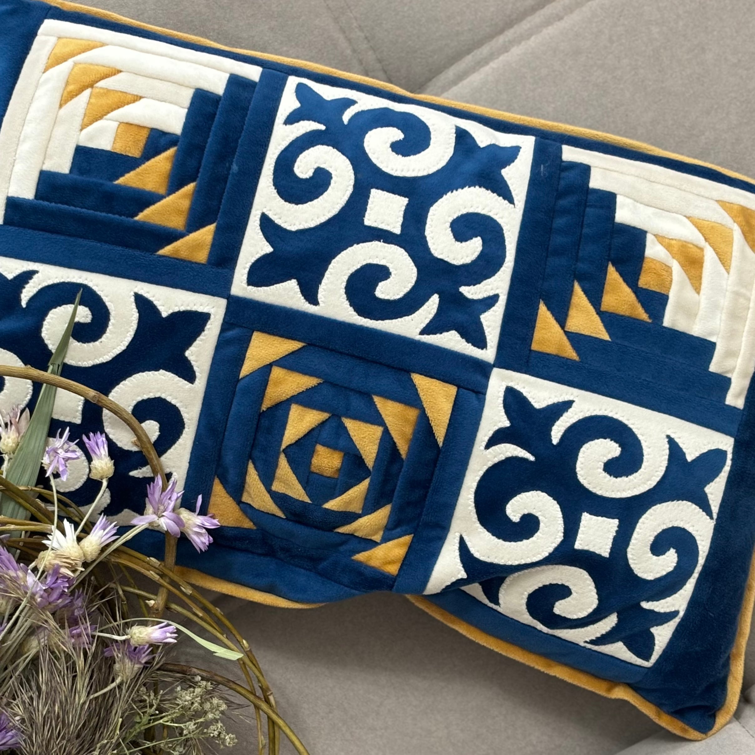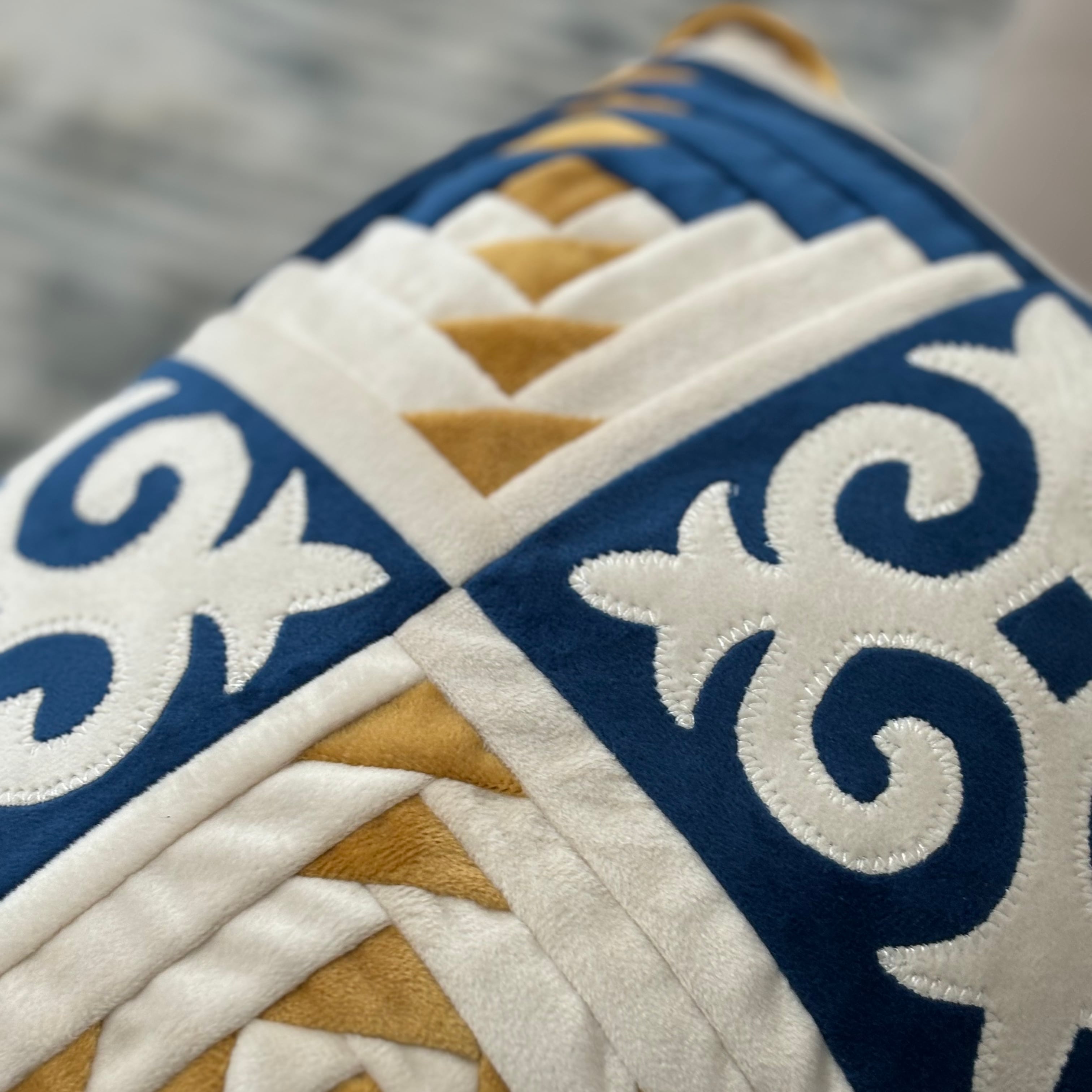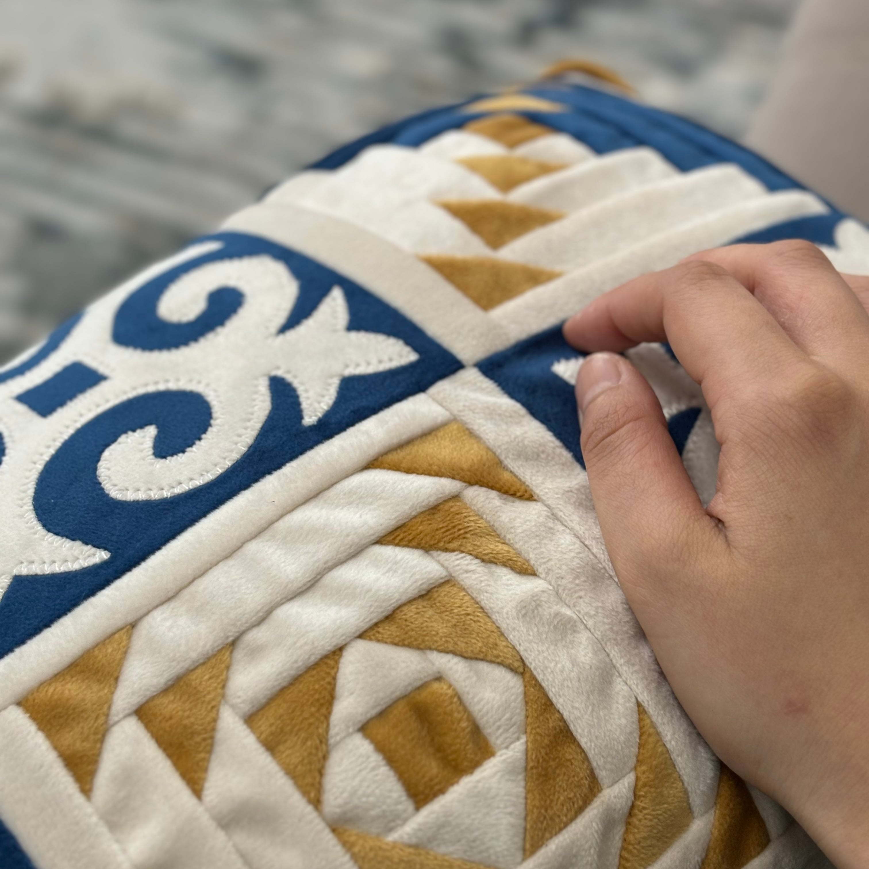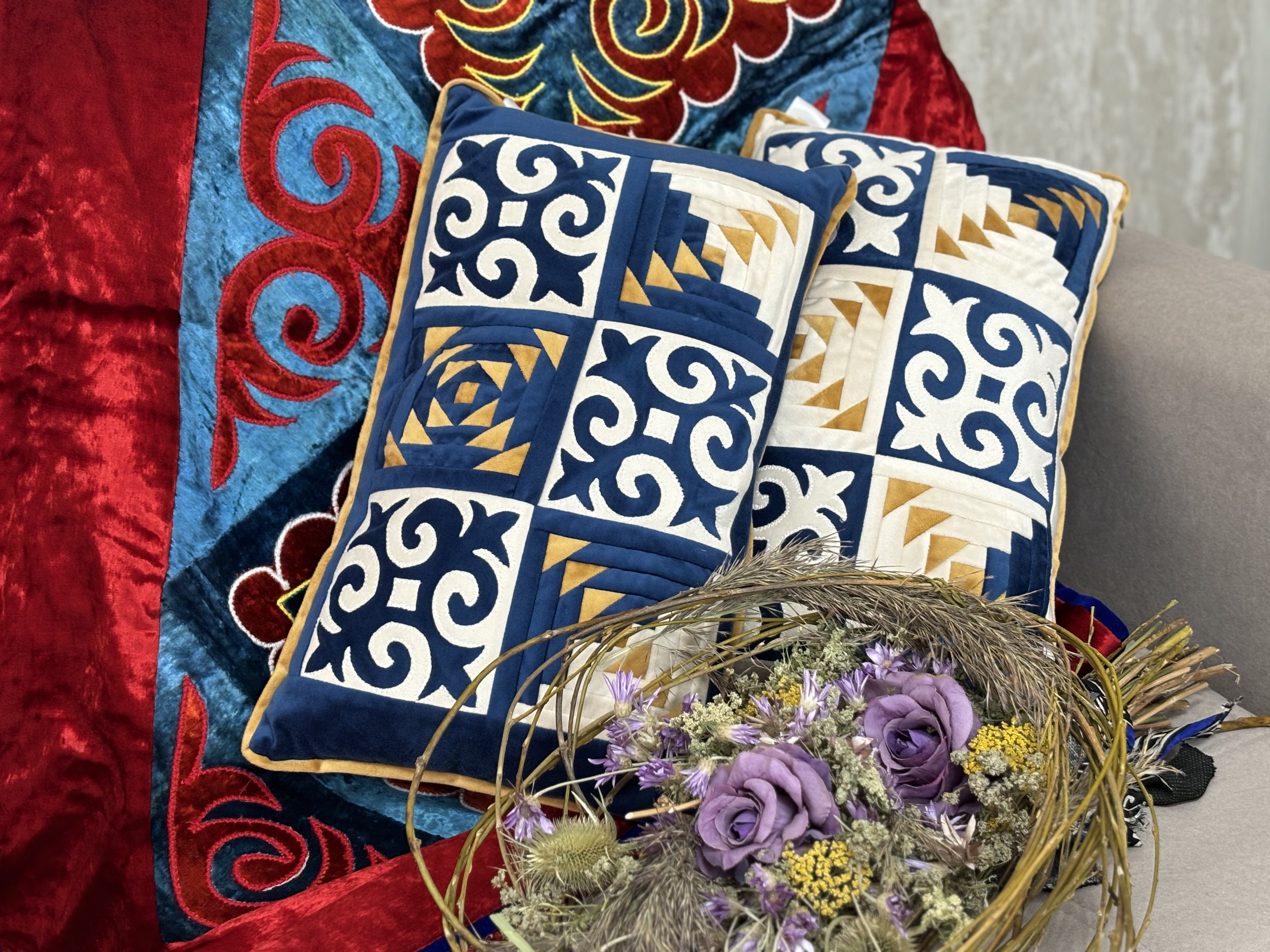 【キルギスのオイモ(伝統柄)がデザインされたパッチワークのクッションカバー】