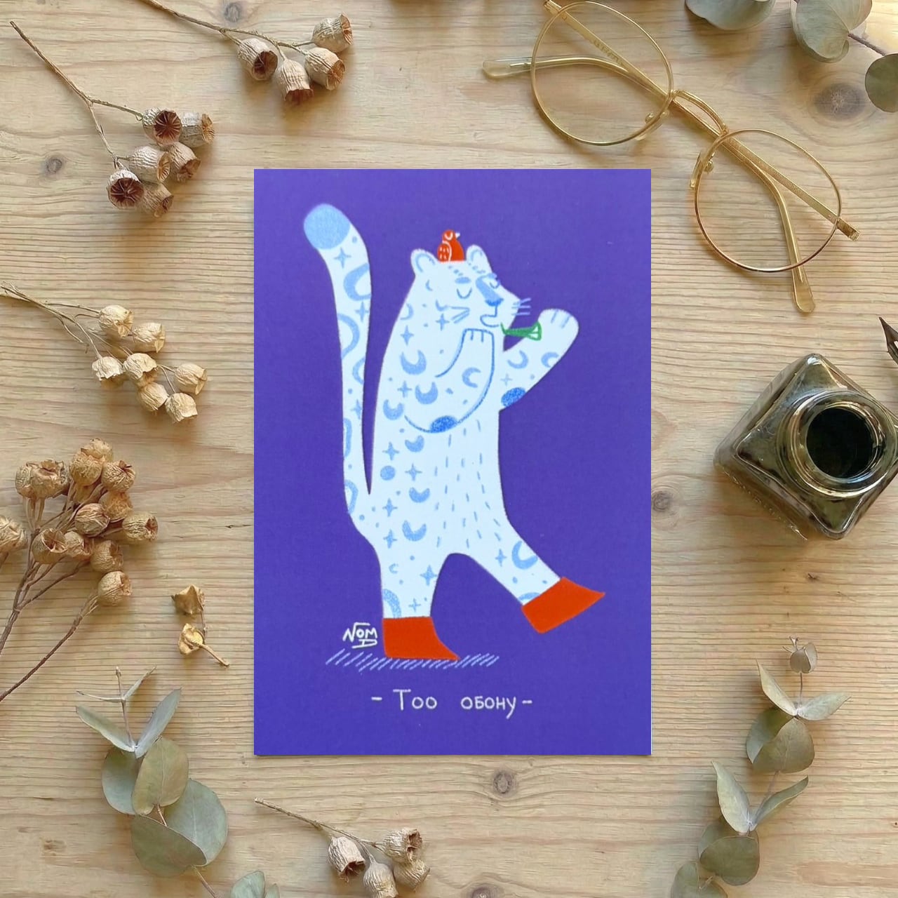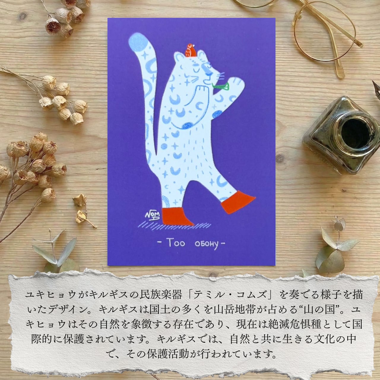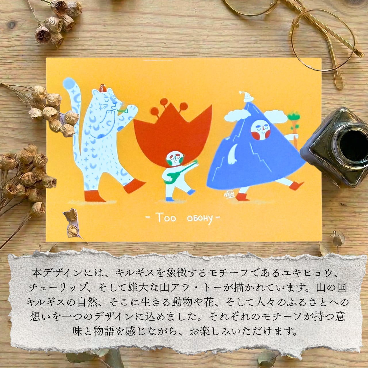 ユキヒョウやチューリップ、アラ・トーの山など、キルギスを象徴する存在に、伝統楽器や民族文化のエッセンスを掛け合わせたデザインです。