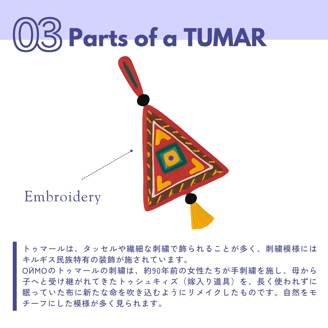 刺繍模様には、キルギスの自然や生命の循環を象徴する模様が多みられます。今回のトゥマールに使用しているトゥシュキィズには、植物の成長を表すデザインが施され、「成長」や「繁栄」への願いが込められています。