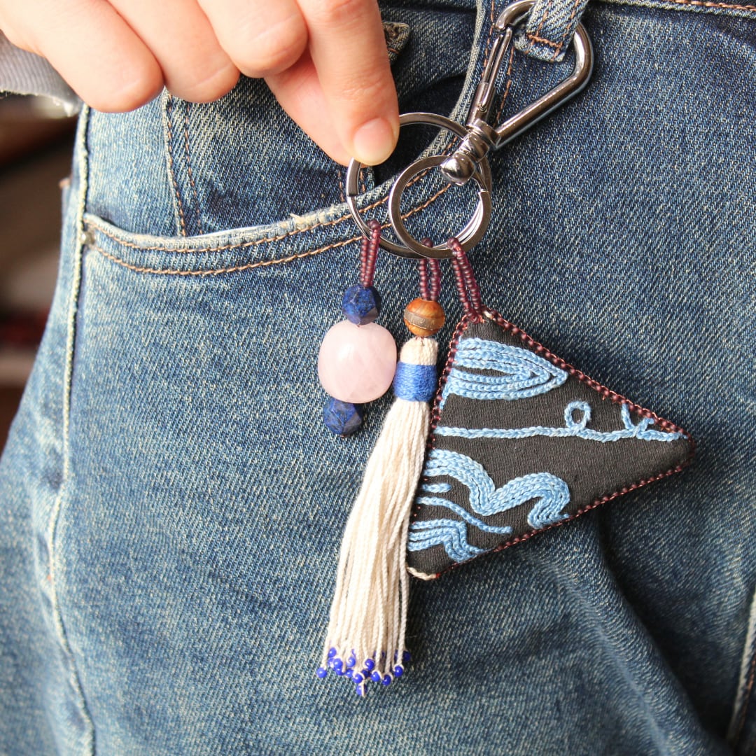また、下にあしらわれたタッセルもトゥシュキィズに由来し、古くから装飾・お守り・祝福の象徴として使われてきました。中央アジアで昔から使用されてきたタッセルを使用しています。