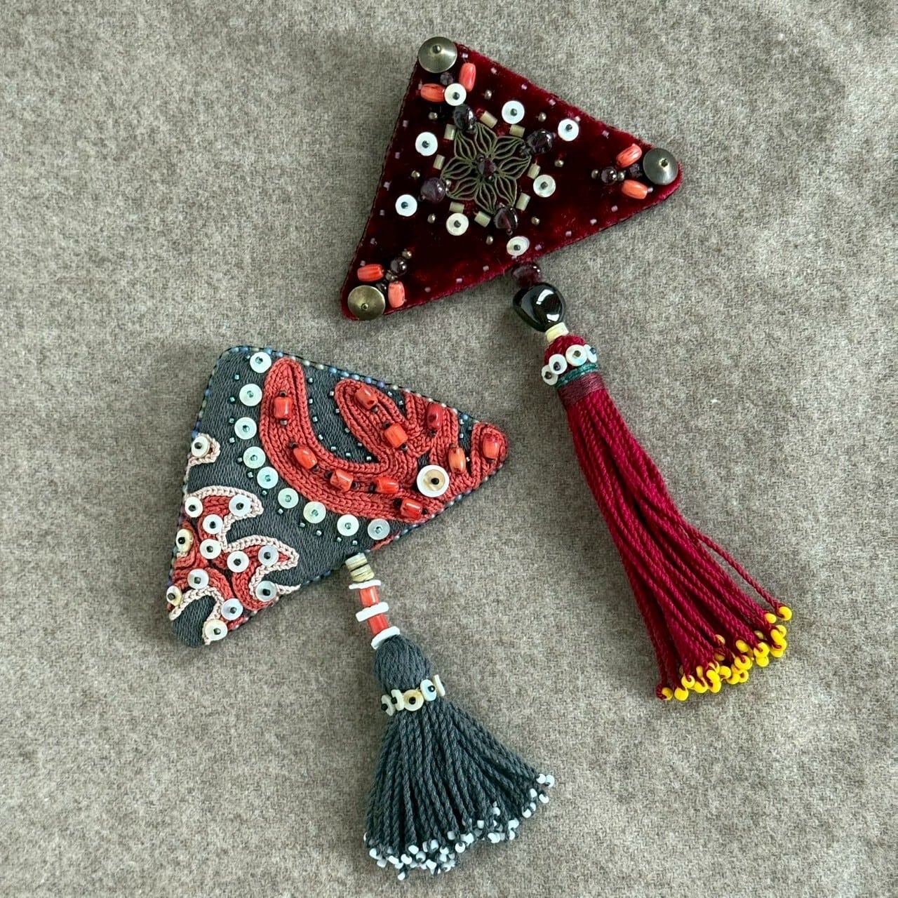 現地で遥か昔から継承されてきた布地(「トゥシュキイズ」手刺繍の花嫁道具)やパーツを使用。 キルギスの自然と文化の息吹を感じながら、お守りとしてだけでなく、おしゃれなアクセサリーとしてもお楽しみいただけます。